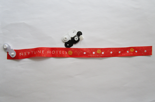 satin wristband with one time use PVC button